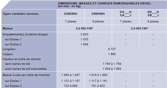 Les valeurs de mtra et de charges remorquables indiquées sont valables pour une altitude maxi de 1000 mètres ; la charge remorquable mentionnée doit être réduite de 10 % par paliers de 1000 mètres supplémentaires.